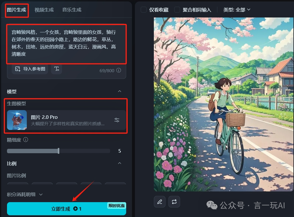 操作步驟: 第一步:圖片生成 首先打打開(kāi)即夢(mèng)官網(wǎng):https://jimeng.jianying.com/ 首先打開(kāi)即夢(mèng)官網(wǎng),進(jìn)入圖片生成頁(yè)面,選擇圖片生成,在方框里填入提示詞:宮崎駿風(fēng)格,一個(gè)女孩,宮崎駿里面的女孩,騎行在郊外的春天的田園小路上,路邊的鮮花,草叢,樹(shù)木,田地,遠(yuǎn)處的房屋,藍(lán)天白云,漫畫(huà)風(fēng),高清晰度。 生圖模式選擇2.0Pro,生圖比例選3比4,點(diǎn)擊立即生成。