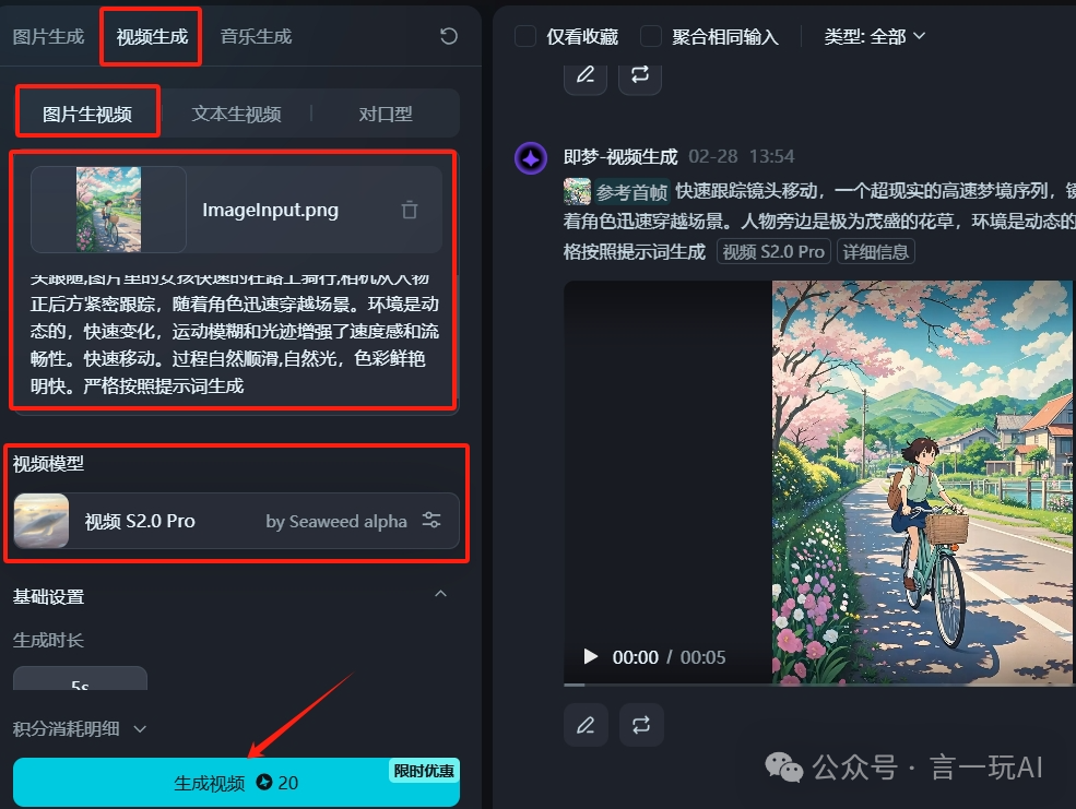 第二步是圖片生視頻 從生成出來(lái)的四張圖片,選擇自己喜歡的一張HD超清效果,再選擇生成視頻,在方框里填入提示詞:快速跟蹤鏡頭移動(dòng),一個(gè)超現(xiàn)實(shí)的高速夢(mèng)境序列,鏡頭跟隨,圖片里的女孩快速的在路上騎行,相機(jī)從人物正后方緊密跟蹤,隨著角色迅速穿越場(chǎng)景。環(huán)境是動(dòng)態(tài)的,快速變化,運(yùn)動(dòng)模糊和光跡增強(qiáng)了速度感和流暢性??焖僖苿?dòng)。過(guò)程自然順滑,自然光,色彩鮮艷明快。嚴(yán)格按照提示詞生成。 視頻模型選擇視頻S2.0Pro,點(diǎn)擊立即生成。把生成出來(lái)的視頻下載到電腦。