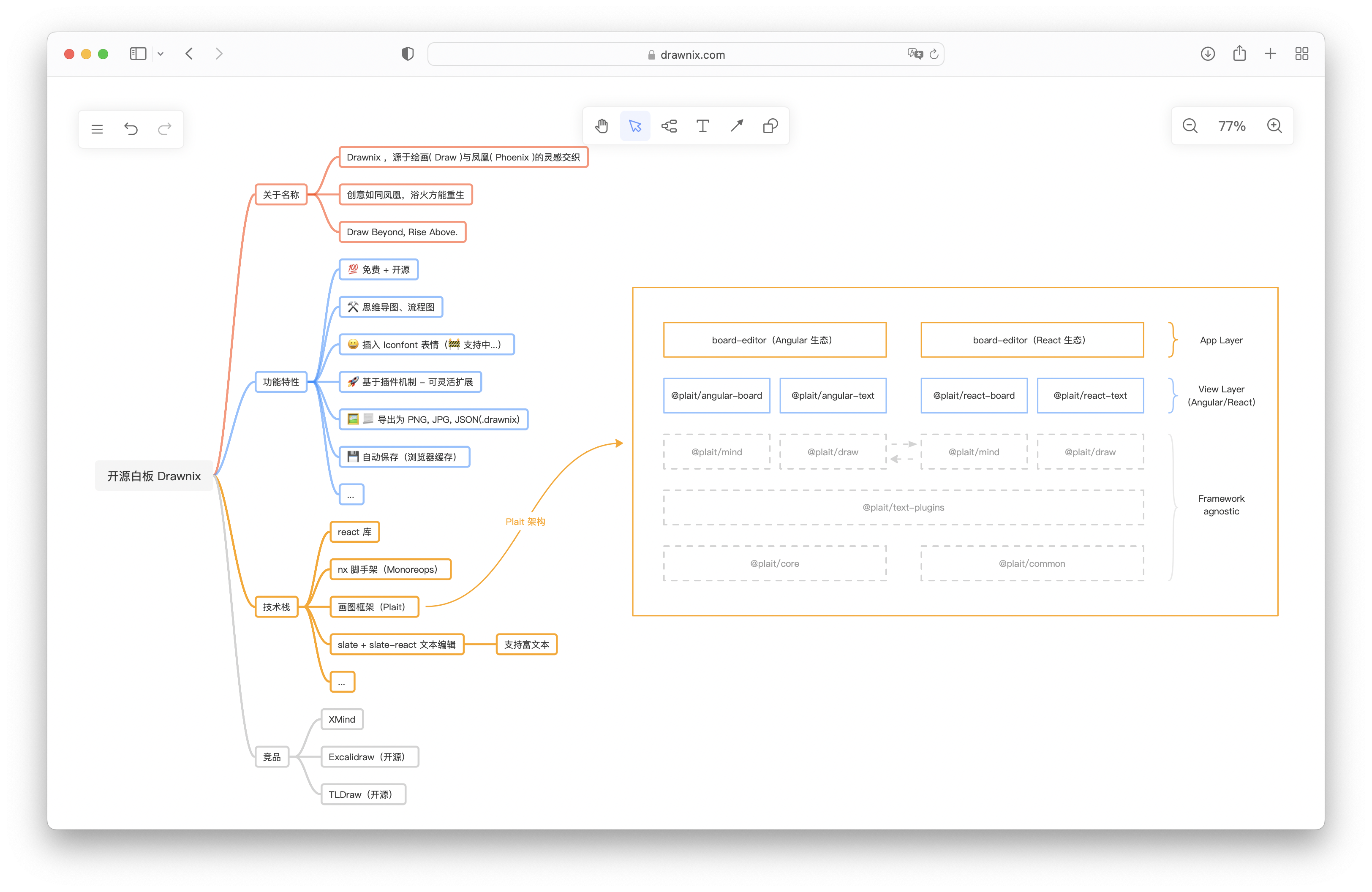 ?在線白板工具 Drawnix —— 名字源于繪畫(Draw)與鳳凰(Phoenix)的靈感交織。 Drawnix 的定位是一個開箱即用、開源、免費的在線白板工具產(chǎn)品, 集思維導圖、流程圖、畫筆于一體,目前它剛啟動幾個月,還在持續(xù)迭代基礎功能,大家有做流程圖、思維導圖的需求時不妨試一試,有任何的缺陷或者基礎交互問題我都會及時跟進處理。