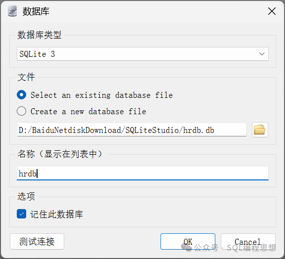 然后選擇一個(gè)已經(jīng)存在的 SQLite 數(shù)據(jù)庫(kù)文件或者新建一個(gè)空白數(shù)據(jù)庫(kù)文件。