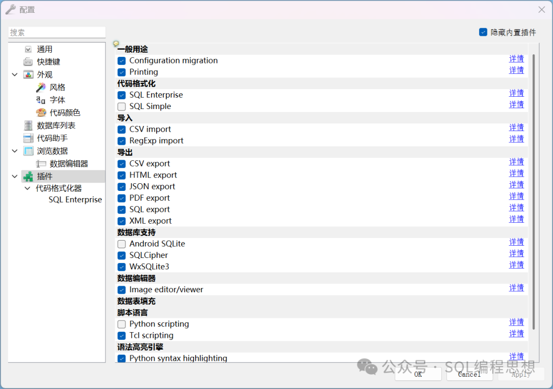 這個(gè)配置界面還可以對(duì)它的外觀、快捷鍵、代碼助手、數(shù)據(jù)瀏覽器等功能進(jìn)行設(shè)置。