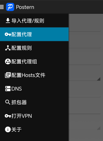 2、添加代理服務(wù)器:打開Postern后,點(diǎn)擊菜單按鈕-》【配置代理】-》【添加代理服務(wù)器】