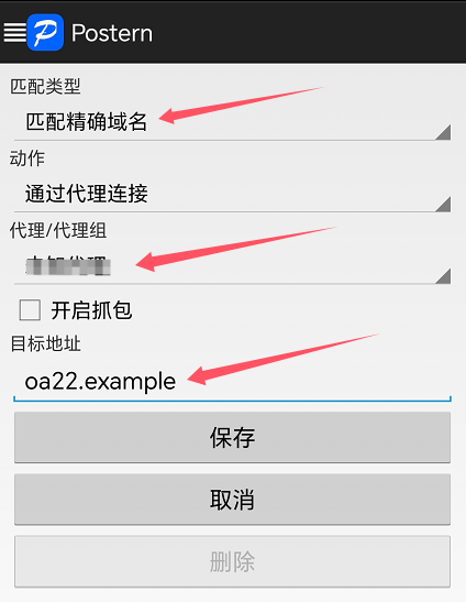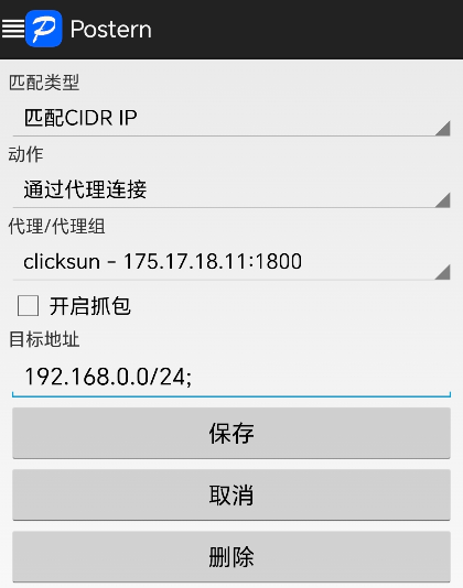 常規(guī)用法: 如果只使用了單一代理服務(wù)器并且代理服務(wù)器的內(nèi)部局域網(wǎng)IP網(wǎng)段與手機(jī)WIFI當(dāng)前本地局域網(wǎng)IP網(wǎng)段不相同(手機(jī)流量上網(wǎng)無此問題),或者使用了多組代理服務(wù)器但各個(gè)代理服務(wù)器的內(nèi)部局域網(wǎng)IP段不相同,那么需要訪問代理服務(wù)器所在局域網(wǎng)內(nèi)部的所有電腦時(shí),應(yīng)該使用“匹配CIDR IP”,目標(biāo)地址設(shè)置為:192.168.0.0/24(假設(shè)代理服務(wù)器所在局域網(wǎng)內(nèi)部網(wǎng)段為192.168.0.*),表示這一個(gè)網(wǎng)段的所有IP都要用代理服務(wù)器中轉(zhuǎn)。 另外,需要注意postern不支持只保存一個(gè)IP,即使是這個(gè)IP地址是符合CIDR規(guī)范的格式,例如:192.168.0.8/32 就是一個(gè)符合CIDR規(guī)范格式的單一IP地址,但保存時(shí)會(huì)提示錯(cuò)誤:目標(biāo)地址包含非法數(shù)據(jù),無法保存,必須按照上面這個(gè)IP網(wǎng)段或域名的方式保存。 高級(jí)用法: 如果使用了多組代理服務(wù)器并且部分代理服務(wù)器的內(nèi)部局域網(wǎng)IP網(wǎng)段相同,或者只使用了單一代理服務(wù)器但代理服務(wù)器的內(nèi)部局域網(wǎng)IP網(wǎng)段與手機(jī)WIFI當(dāng)前本地局域網(wǎng)IP網(wǎng)段相同、只需要指定的IP地址才使用代理服務(wù)器中轉(zhuǎn)(手機(jī)流量上網(wǎng)無此問題),那么需要使用“匹配精確域名”模式,利用自定義域名曲線實(shí)現(xiàn)相同IP段的精準(zhǔn)識(shí)別。例如在兩個(gè)不同代理服務(wù)器的局域網(wǎng)內(nèi)各有一個(gè)電腦,地址都是192.168.0.8,用上面“匹配CIDR IP”模式是無法區(qū)分識(shí)別這兩個(gè)IP地址的,可通過將 IP 轉(zhuǎn)換為域名的方式“欺騙”規(guī)則,分別命名為:oa11.example 和 oa22.example,用記事本修改相應(yīng)代理服務(wù)器的 hosts 文件(位置:代理服務(wù)器上C:\Windows\System32\drivers\etc\hosts)中將 oa11.example 解析到 192.168.0.8,oa22.example 解析到 192.168.0.8,如果是代理服務(wù)器自己,那么直接設(shè)置為 127.0.0.1 即可。然后設(shè)置兩條規(guī)則,都將規(guī)則設(shè)置為使用“匹配精確域名”模式,“代理/代理組”選擇相應(yīng)的代理服務(wù)器,“目標(biāo)地址”分別設(shè)置為“oa11.example”、“oa22.example”。