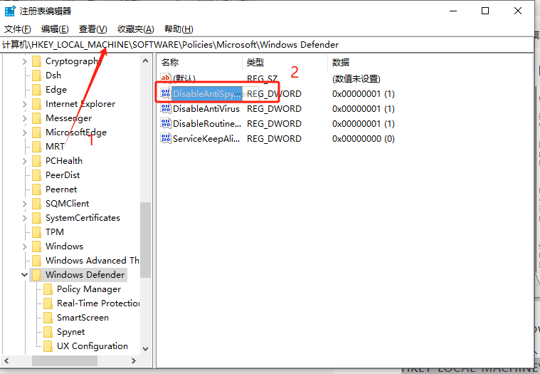 按 “Windows鍵+R,輸入 “regedit”,回車啟動注冊表編輯器。定位到 HKEY_LOCAL_MACHINE\SOFTWARE\Policies\Microsoft\Windows Defender,新建一個 DWORD 項,命名為 DisableAntiSpyware ,雙擊該項后值設(shè) 0 為開啟,1 為關(guān)閉 Windows 安全中心。重啟電腦之后,就可以徹底關(guān)閉Windows defender了!
