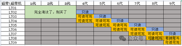 LTO磁帶技術(shù)實際上遠沒有硬盤那么“老” 這件事有什么意義呢?要知道咱們普通人買磁帶機都是二手設(shè)備,這個技術(shù)更新時間,就是推斷,你未來什么時候才有可能更方便、更便宜的在二手市場上買到這些產(chǎn)品。當(dāng)前二手市場上的熱門是第五代,你沒看錯,已經(jīng)是十幾年前的技術(shù)了。如果你想用到當(dāng)下最新的第九代的二手設(shè)備,你可以估算一下,要等待多久…… 2.有限兼容 發(fā)展到現(xiàn)在,已經(jīng)到了第九代,和我們熟悉的硬盤不同,磁帶機做的技術(shù)路線是有限兼容,即,某一代磁帶機,只支持讀寫同一代和前一代的磁帶;再前一代的磁帶就只能進行讀取而不支持寫入,并且只截止支持三代這么多的可用范圍。 以我買的LTO5磁帶機為例,它只能完美讀寫使用LTO4和LTO5技術(shù)的磁帶,再支持一個LTO3磁帶的“只讀”,就是它能做到的全部了。 為了方便理解,我同樣做了一個圖表來方便大家理解: