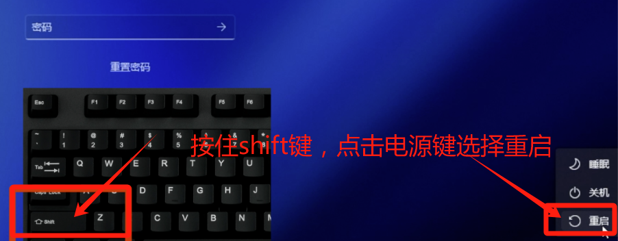 嘗試開不了機后,在輸入密碼界面, 按住鍵盤上的 SHITF 鍵不放,同時點擊右下角的電源按鈕,