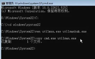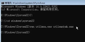 ③接著輸入ren utilman.exe utilmanbak.exe回車