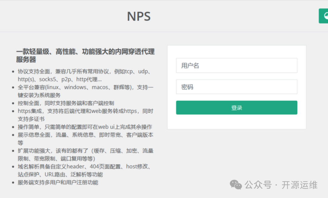 NPS 是一款兼具高性能與易用性的開源內(nèi)網(wǎng)穿透代理工具。不僅功能完善,支持幾乎全部主流協(xié)議、全面整合HTTPS和日志管理,還提供簡單易用的Web管理終端,是運維人、開發(fā)者遠程調(diào)試和實現(xiàn)設備公網(wǎng)映射的必備利器!無論是個人用戶還是團隊,都可輕松實現(xiàn)復雜場景的遠程需求。