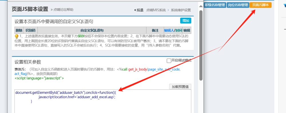在頁面的js添加以下代碼,再重進(jìn)才能使用 document.getElementById("adduser_batch").onclick=function(){ javascript:location.href='adduser_add_excel.asp'; } 如下圖: 點晴模切ERP更多信息:http://moqie.clicksun.cn,聯(lián)系電話:4001861886 該文章在 2025/3/21 14:01:35 編輯過 |