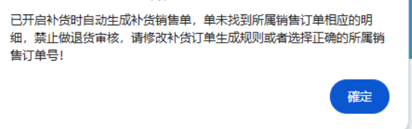 點晴模切ERP-彈出提示:已開啟補貨時自動生成補貨銷售單,單未找到所屬銷售訂單相應的明細,禁止做退貨審核,請修改補貨訂單生成規(guī)則或者選擇正確的所屬銷售訂單號