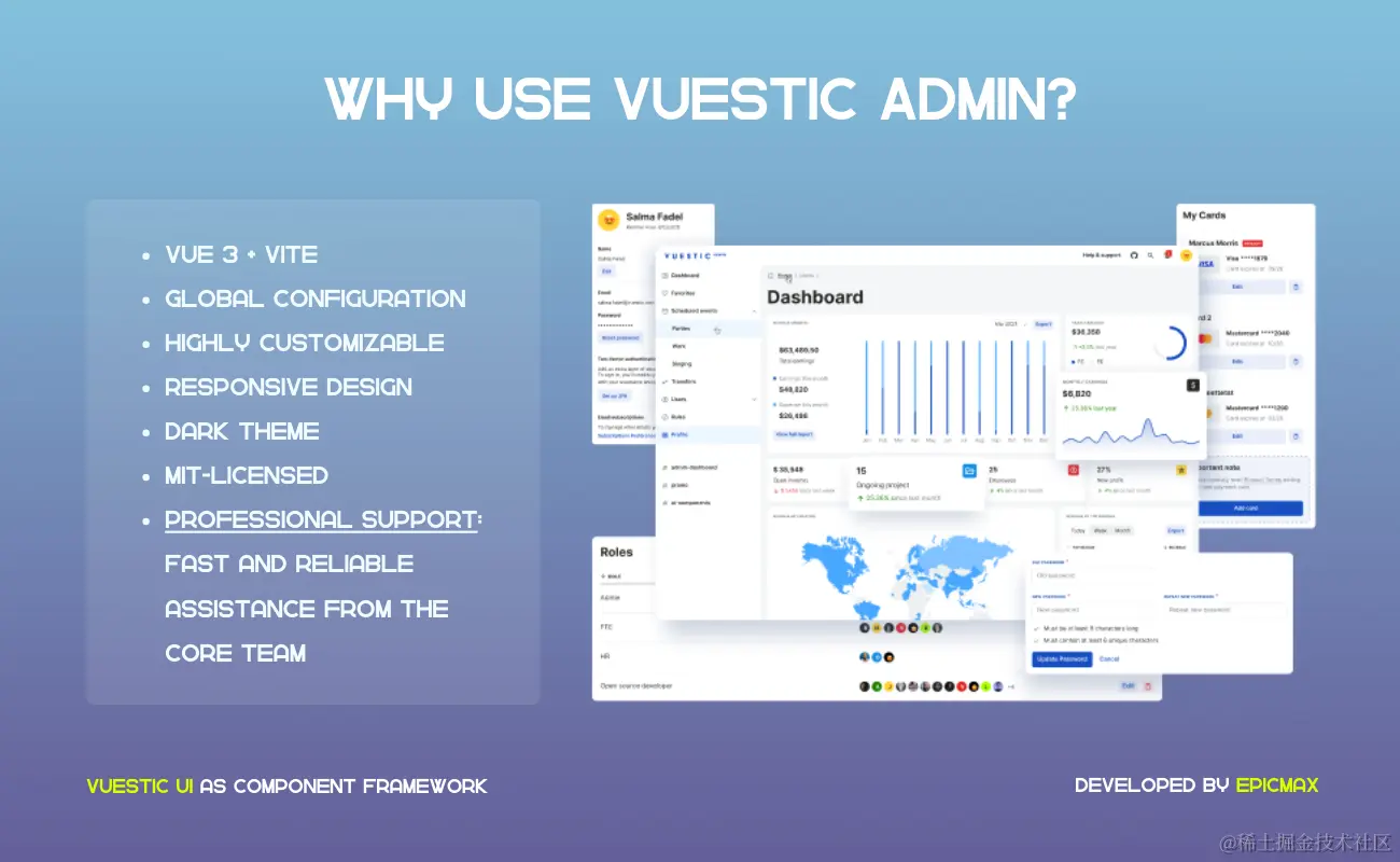 6. 開源:作為一個(gè)開源項(xiàng)目,Vuestic Admin 允許開發(fā)者自由地使用、修改和分發(fā)代碼,這為社區(qū)驅(qū)動(dòng)的開發(fā)和持續(xù)改進(jìn)提供了可能。