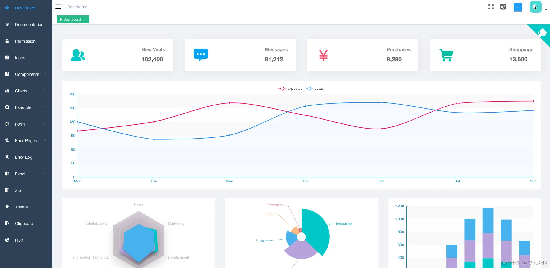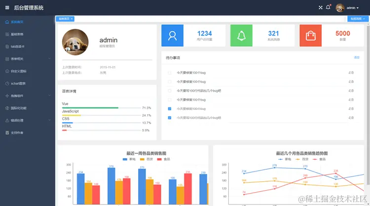 適用于絕大部分后臺(tái)管理系統(tǒng)開發(fā)的多功能框架模板,基于Vue.js和Element UI組件庫(kù),支持手動(dòng)切換主題色和自定義主題色。Github上已被Star18.2k,V 哥覺得整體風(fēng)格還不錯(cuò),兄弟們做項(xiàng)目也可以考慮。