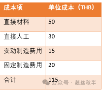 ??示例計算: 三、成本加成定價法 ??成本加成定價法(Cost-Plus Pricing) 是最常用的定價方式之一,它的核心公式如下: 售價=成本+成本×目標(biāo)加成率 ??計算示例 假設(shè)某產(chǎn)品的單位成本計算如下: ![]() 如果公司希望獲得30%的加成利潤,那么最終售價為: 售價=115+(115×30%)=149.5THB。 ??如果客戶反饋目標(biāo)價為105泰銖時,是否接受訂單? step1:計算客戶目標(biāo)價下的毛利情況 客戶目標(biāo)價:105THB; 單位產(chǎn)品成本:115THB; ?結(jié)論:毛利為-10THB,訂單虧損,不建議接受。 step2:進一步分析是否應(yīng)考慮接受? ?可能接受的情況: