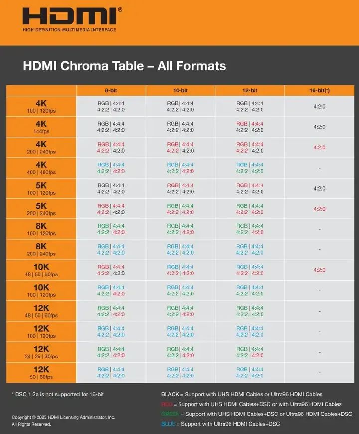 而HDMI也不甘示弱,馬上發(fā)布最新的版本是2.2,有著驚人的96Gbps帶寬: