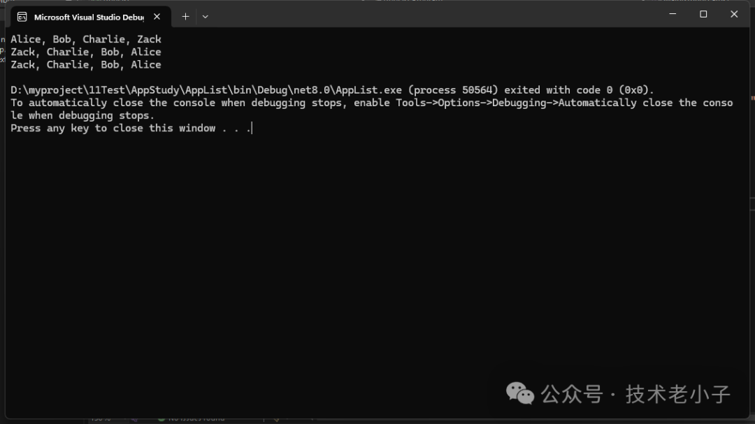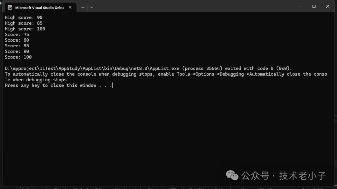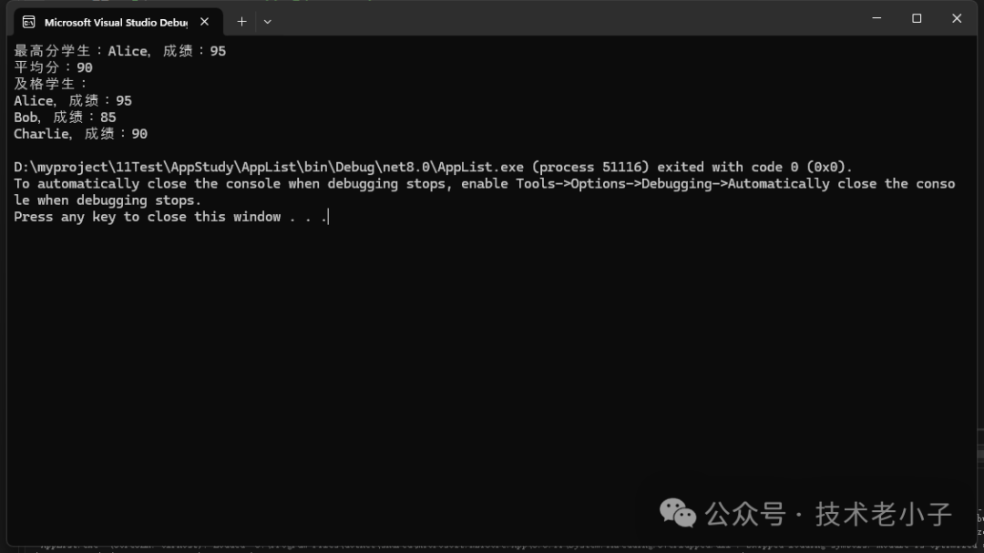namespace AppList { publicclassStudent { publicstring Name { get; set; } publicint Score { get; set; } } internal classProgram { staticvoidMain(string[] args) { // 創(chuàng)建學(xué)生列表 List<Student> students = new List<Student> { new Student { Name = "Alice", Score = 95 }, new Student { Name = "Bob", Score = 85 }, new Student { Name = "Charlie", Score = 90 } }; // 查找成績最高的學(xué)生 var topStudent = students.OrderByDescending(s => s.Score).First(); // 計算平均分 var averageScore = students.Average(s => s.Score); // 找出及格的學(xué)生 var passedStudents = students.FindAll(s => s.Score >= 60); Console.WriteLine($"最高分學(xué)生:{topStudent.Name},成績:{topStudent.Score}"); Console.WriteLine($"平均分:{averageScore}"); Console.WriteLine("及格學(xué)生:"); foreach (var student in passedStudents) { Console.WriteLine($"{student.Name},成績:{student.Score}"); } } } }