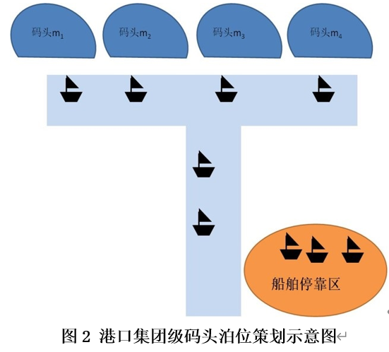 橋機工作計劃就是安排可調(diào)用橋機盡快完成集裝箱裝卸作業(yè),在上述約束條件之下,將完成單船裝卸作業(yè)的工作時間最小化。橋機工作計劃問題是TOS系統(tǒng)的核心問題,得到國內(nèi)外學(xué)界和產(chǎn)業(yè)界的廣泛關(guān)注。Zhu等[8]以橋機之間不可交叉移動為約束,以橋機工作時間最小化為優(yōu)化目標(biāo),利用分支定界和模擬退火算法分別對模型進行求解,最終得到橋機在不同貝位的工作順序;Daganzo[9]研究橋機在1個貝位上工作時可被打斷的情況,與以往的研究不同,1個貝位上的工作可由多個橋機共同完成,但作者并未考慮橋機不能交叉移動的約束;Kim等將船貝看作是船艙和甲板的集合,考慮橋機移動時間、不可交叉、安全操作距離等約束建立數(shù)學(xué)規(guī)劃模型,并設(shè)計分支定界算法和貪婪隨機自適應(yīng)搜索算法;Moccia等在Kim等的基礎(chǔ)上,提出更加嚴(yán)格的數(shù)學(xué)模型,并提出分支切割算法;Sammarra等在此基礎(chǔ)上又提出一種禁忌搜索方法,通過降低解的質(zhì)量,大幅縮短求解時間;陸書翔等建立該問題的多目標(biāo)工作計劃數(shù)學(xué)模型和基于完工時間下界的近似算法。 2.3 自動配載 自動配載是指在需要裝船的集裝箱及其在堆場的具體位置已知的前提下,按照船公司的預(yù)配要求給堆場內(nèi)每個需要裝船的集裝箱安排對應(yīng)的船舶位置,使總裝卸效益最大。自動配載的結(jié)果需要滿足預(yù)配船圖的所有規(guī)則,給出所有需要配載的出口集裝箱對應(yīng)船艙上的位置,在此基礎(chǔ)上還需要給出每個集裝箱的裝載順序。因此,自動配載的任務(wù)不僅需要考慮集裝箱屬性對于其最終裝載位置的影響,還需要考慮出口集裝箱的堆場分布和出箱點對于裝配順序的影響。由于自動配載的目標(biāo)就是在保證船公司配載規(guī)則的條件下使碼頭作業(yè)效率最高,因此必須考慮船公司的配載要求。船公司的配載要求中只指定船艙上的列位位置的集裝箱的屬性(特殊箱、卸貨港、高平箱和箱尺寸等),所以該問題可以抽象成如下集合匹配問題:列位位置集合S={s1,s2,…,sn},預(yù)裝集裝箱集合T={t1,t2,…,tn}。每個集裝箱的屬性(重量、尺寸、卸貨港等)已知,每個列位位置規(guī)定所放集裝箱滿足的屬性已知。需要建立1個映射f:S→T在滿足每個位置對應(yīng)的箱子屬性要求的前提下,使碼頭裝卸效率最高(橋機效率高、翻箱量少、堆場設(shè)備無謂移動少等)。 Wilson等對自動配載問題提出兩階段分塊求解策略;Kang等在此基礎(chǔ)上進行了進一步研究;張維英等采用基于二叉搜索樹的啟發(fā)式裝箱算法求解;Delgado等給出了一種快速的近似算法。 港口泊位策劃模型和算法 考慮到帶有航道約束的多碼頭泊位策劃問題,采用連續(xù)型泊位分配方法,在優(yōu)化泊位方案的同時考慮單向航道進出的問題。模型假設(shè)如下: