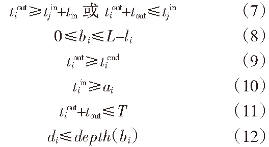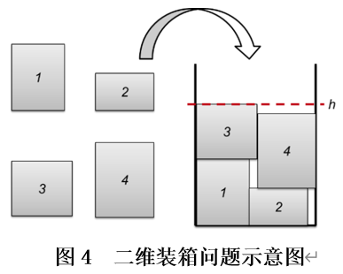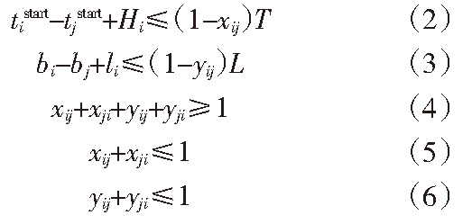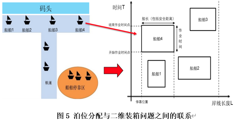 本文中,將泊位策劃問題轉(zhuǎn)化為二維裝箱問題(Two-Dimensional BinPacking Problem,2DBPP)。經(jīng)典的二維裝箱問題為:給定1定數(shù)量的小矩形,給定1個大矩形,將所有的小矩形裝入大矩形中,使得裝入高度最低。二維裝箱問題示意圖見圖4。 將二維裝箱問題與泊位策劃模型聯(lián)系起來,泊位分配與二維裝箱問題之間的聯(lián)系見圖5。圖中左邊的船舶1至船舶4對應(yīng)右側(cè)中的矩形。也就是說,1個矩形就代表了1艘船只的泊位分配。因此,要求右圖所有的矩形不重合,并按一定約束裝入該“大矩形”,使總作業(yè)時間盡可能地少。 3.1 模型參數(shù)、目標(biāo)和約束條件 方案目標(biāo)為最后一艘船只離開港口的時間點減去第一艘船只到港的時間點的間隔時間最小化,該時間差代表所有船只從開始到結(jié)束作業(yè)所用時間的總和。因此,該模型的目標(biāo)函數(shù)為 模型約束條件為