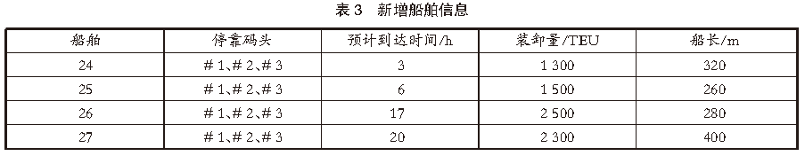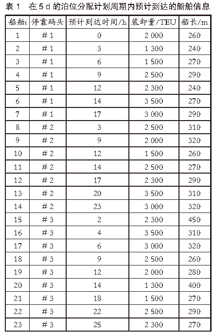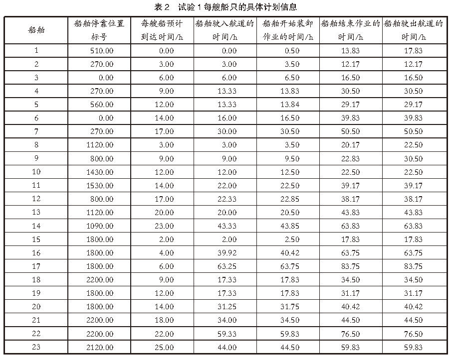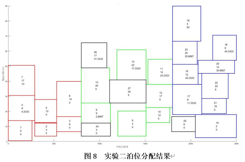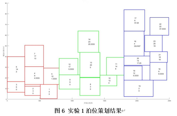式中:i∈N(i=1,...,n)為n艘船只集合;L為碼頭岸線長;T為規(guī)劃時間;li為每艘船的長度,包含安全距離;di為每艘船的吃水深度;ai為每艘船預(yù)計到達(dá)的時間;Hi為每艘船作業(yè)時間;tin為駛?cè)牒降浪钑r間;tout為駛出航道所需時間;Vi為每艘船的速度;Wi為每艘船的貨物量;depth(bi)為??课恢胋i處能承受的最深出水深度;bi為船舶停靠位置;tiin為船舶駛?cè)牒降赖臅r間點;tistart為船舶開始裝卸作業(yè)的時間點;tiend為船舶結(jié)束作業(yè)的時間點;tiout為船舶駛出航道的時間點,xij表示若船舶i完全在j的左方,則為1,否則為0;yij表示若船舶i完全在j的下方,則為1,否則為0。 約束(2)~(6)保證船只作業(yè)計劃在二維圖上不重疊,約束(7)保證航道單向的特點,約束(8)保證??课恢迷诎毒€范圍內(nèi),約束(9)保證駛出時刻一定在結(jié)束作業(yè)時刻之后,約束(10)保證駛?cè)牒降罆r間一定在到港時間之后,約束(11)保證作業(yè)時間一定在規(guī)劃時間之內(nèi),約束(12)保證船只??康奈恢梅洗怀运疃取o@然,若遇到多個碼頭的情況,只需將L分為多個Li,然后對bi進行約束即可。 3.2 模型求解 MATLAB中Intlinprog進行整數(shù)線性規(guī)劃編程。在實驗數(shù)據(jù)的設(shè)計上,一共模擬23艘船只,這些船只需要分別??吭诟劭诘?個碼頭,在5 d的泊位分配計劃周期內(nèi)預(yù)計到達(dá)的船舶信息見表1,其中包含船只預(yù)計到達(dá)時間、船舶的裝載量以及船長。 假設(shè)# 1碼頭岸線為0~800 m,# 2碼頭岸線為800~1 800 m,#3碼頭岸線為1 800~ 2 500 m,假設(shè)每個碼頭裝卸效率為150自然箱/h,碼頭泊位水深都能滿足船只吃水線要求。在此基礎(chǔ)上運行程序240 s,得到泊位分配計劃,實驗1泊位策劃結(jié)果見圖6。其中,左側(cè)3列、中間3列、右側(cè)2列方框分別表示只能??? 1、# 2、# 3碼頭。方框中,第1個數(shù)字代表第i艘船,第2個數(shù)字代表船只到達(dá)時間,第3個數(shù)字代表在??繀^(qū)域等待時間,需要盡量讓船只在完成手續(xù)的前提下盡快作業(yè),因此等待時間越短越好。 在完成泊位計劃后,該情況下的航道占有情況也相應(yīng)而出。 最后得到23艘船在港作業(yè)總時間為84.5h。試驗1每艘船只的具體計劃信息見表2。表2的每一列將船只的具體??课恢谩⒕唧w進出港口的時間點、作業(yè)時間、等待時常都相應(yīng)地表示出來,在泊位策劃時可將此表作為參考來進行船只的排位,并進行單向航道的具體規(guī)劃。由航道規(guī)劃可知,航道進出的時間就整個5 d的規(guī)劃長度來說較為離散。因此,在實際運用中,可以人為地對航道進出時間進行調(diào)試,而不會影響到整體的規(guī)劃。由圖6可以看出,二維圖中的空缺處較少,可知每個碼頭的碼頭利用率較高。船只的長度有400 m量級的大船,也有200 m量級的小船,總體符合港口實際情況。 考慮到部分船舶可以??咳我獯a頭。因此,在原來數(shù)據(jù)基礎(chǔ)上,新增4艘可以??咳我獯a頭的船舶,新增船舶信息見表3,其他參數(shù)不變,重新運行程序,經(jīng)過1 400 s的計算,試驗2泊位分配結(jié)果見圖8,其中最優(yōu)在港時間為90.58 h。 該文章在 2025/3/28 18:28:54 編輯過 |