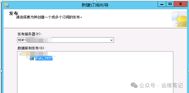 4、點擊鏈接 ,選擇要為其創(chuàng)建一個或多個訂閱的發(fā)布,我們選擇發(fā)布服務(wù)器 WIN-XXX 中的數(shù)據(jù)庫發(fā)布 FaBu_TEST,然后點擊【下一步】