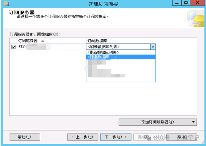 3.4 訂閱服務(wù)器在【訂閱服務(wù)器】對話框中,選擇新建數(shù)據(jù)庫,或者提前建好一個新數(shù)據(jù)庫選擇這個數(shù)據(jù)庫