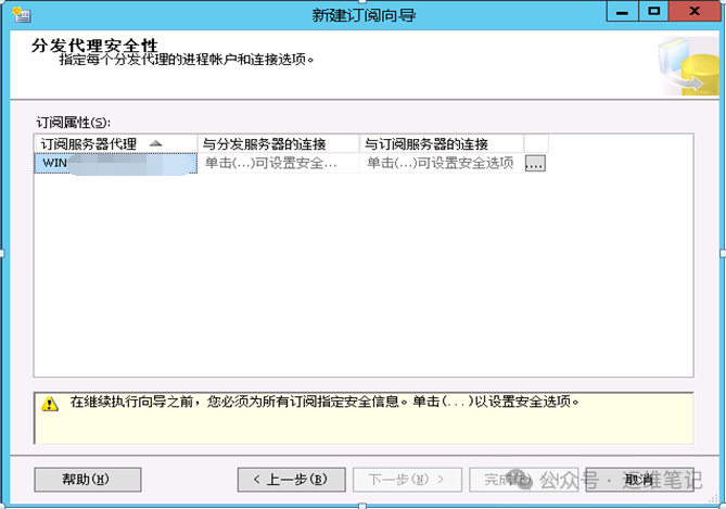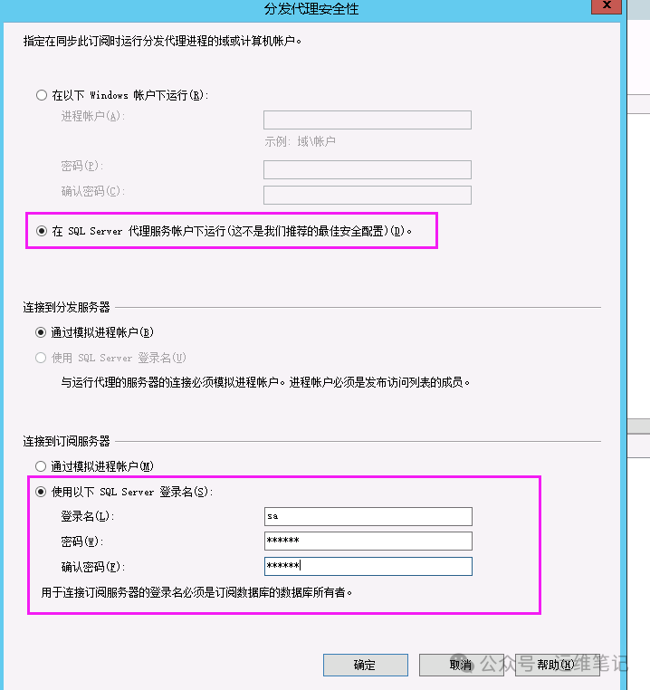 3.5 分發(fā)代理安全性 1、在【分發(fā)代理安全性】對話框中,我們點擊 “...”,進入安全性設(shè)置,我們選則的是 SQL 帳戶