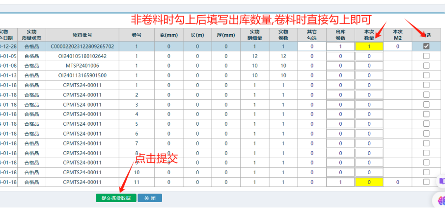然后點擊黃色框出庫數(shù)量,進行庫存選擇出庫 如下圖:
