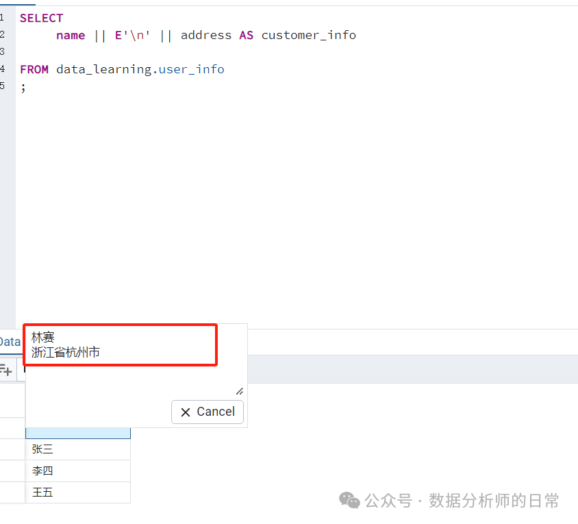 你在工作中是否也有遇到這樣的需求?比如將數(shù)據(jù)庫中的姓名和地址合并展示,但擠在一行太雜亂或者太長? 今天分享這篇文章,主要是我在工作中遇到了一個(gè)圖表可視化的問題,為了實(shí)現(xiàn)更加美觀的效果,我需要將數(shù)據(jù)中的兩個(gè)字段進(jìn)行拼接,并且能夠分行展示。 假設(shè)有一張客戶信息表data_learning.user_info(案例建表語句見文末附錄),包含以下字段: