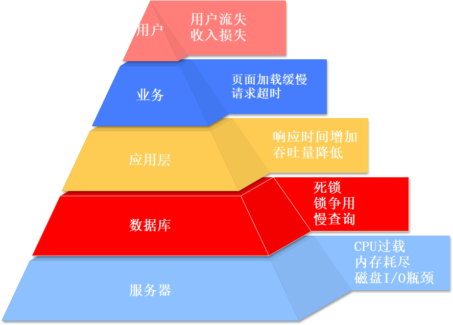 一個(gè)系統(tǒng)即使設(shè)計(jì)之初就考慮了高并發(fā),能夠同時(shí)接收大量請(qǐng)求,但如果單個(gè)請(qǐng)求的處理時(shí)間較長(zhǎng),其響應(yīng)速度和整體性能可能仍不理想。 例如,某接口通過隊(duì)列異步處理請(qǐng)求,雖然能應(yīng)對(duì)高并發(fā),但如果隊(duì)列設(shè)計(jì)不合理或任務(wù)本身耗時(shí)較長(zhǎng)(如5-8秒),會(huì)影響用戶的實(shí)時(shí)體驗(yàn)。 綜上所述,盡管高性能與高并發(fā)緊密相關(guān),它們并不是同一概念。實(shí)際上,高性能的解決方案可以視為高并發(fā)解決方案的一個(gè)重要組成部分,但高并發(fā)系統(tǒng)的設(shè)計(jì)還需綜合考慮分布式架構(gòu)、緩存、限流等技術(shù),以優(yōu)化整體性能和用戶體驗(yàn)。 不滿足高并發(fā)會(huì)有什么后果?在高并發(fā)環(huán)境下,如果系統(tǒng)不能有效處理大量并發(fā)請(qǐng)求,可能會(huì)導(dǎo)致多種嚴(yán)重后果,影響系統(tǒng)的性能和用戶體驗(yàn)。 下圖是系統(tǒng)在高并發(fā)場(chǎng)景下不同的層面的后果表現(xiàn):