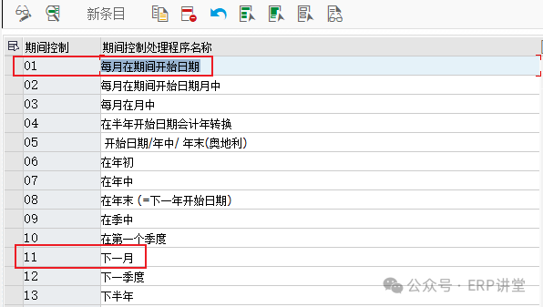 一般使用標(biāo)準(zhǔn)的01-當(dāng)月,11-下月; 3、定義日歷分配 事務(wù)代碼:OAVH 系統(tǒng)路徑:IMG->財務(wù)會計->資產(chǎn)會計核算->折舊->評估方法->期間控制->定義日歷分配 配置目的:定義期間控制對應(yīng)的日歷分配 配置屏幕: