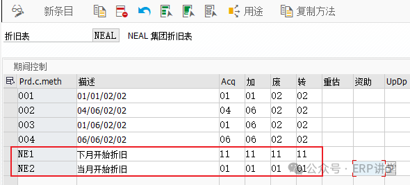 過賬日期在1月31號之前,折舊從(1+1)月開始; 過賬日期在2月29號之前,折舊從(2+1)月開始; …… 過賬日期在12月31號之前,折舊從(12+1)月開始(即下年1月); 這里只有再新建會計年度變式的時候才需要配置,如果使用的系統(tǒng)標(biāo)準(zhǔn)的會計年度變式,這里不需要維護; 4、維護期間控制方法 事務(wù)代碼:AFAMP 系統(tǒng)路徑:IMG->財務(wù)會計->資產(chǎn)會計核算->折舊->評估方法->折舊碼->計算方法->維護期間控制方法 配置目的:定義期間控制對應(yīng)的日歷分配 配置屏幕: