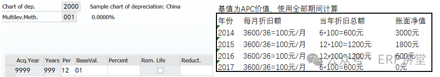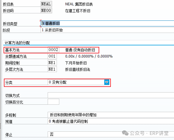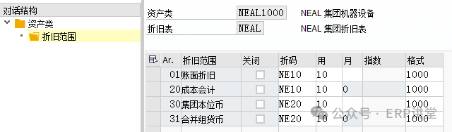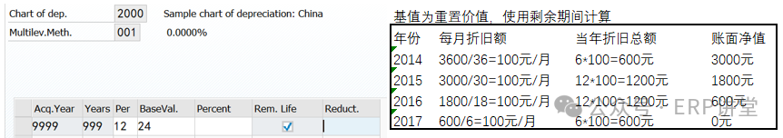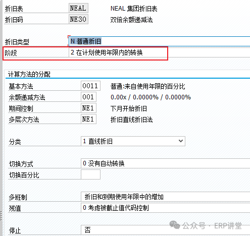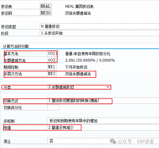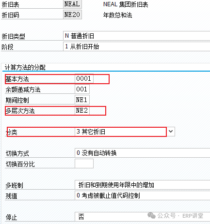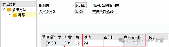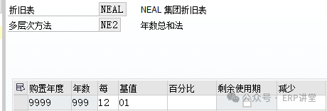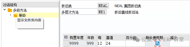 切換方式的邏輯,一般是最后2年修改為直線法,但是系統(tǒng)沒有這個選項,如果要使用這個規(guī)則就需要在這里選擇X,通過系統(tǒng)增強(開發(fā))的方式實現(xiàn); 注意這里多層次方法的設(shè)置: