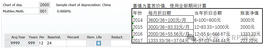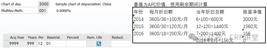 基值: 01 Acquisition value: APC Transactions 03 Replacement value: Acquisition Value = APC Transactions + Revaluation 24 Net book value: Net book value = APC Transactions + Revaluation + Ordinary Depreciation + Special Depreciation+ Unplanned Depreciation + Write up + Value Adjustment + Revaluation ordinary Depreciation 百分比:折舊使用固定的百分比; 剩余使用期:使用剩余期間計算最新的折舊額; 基值 + 剩余使用期的組合對應(yīng)的折舊計算邏輯:
