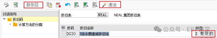 新建的折舊方法都是默認不激活狀態(tài),需要點擊激活,狀態(tài)變成“X 有效的”才可以使用;