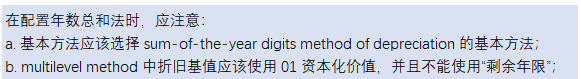 注意年數(shù)總和法中年的概念:如果資產(chǎn)是在年中資本化的,則年數(shù)總和法中折舊的第一年,是從折舊開始計算的,即,折舊開始第一個月到第十二個月為第一年;(這并不是系統(tǒng)要求,而是會計準(zhǔn)確的規(guī)定) C.雙倍余額遞減法的配置