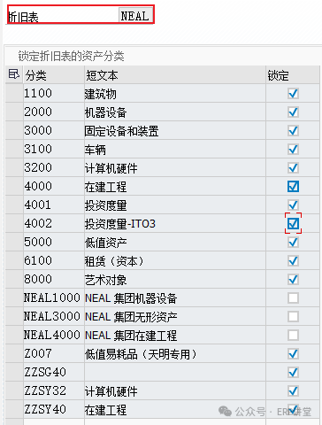 10、取消激活折舊表的資產(chǎn)類 事務(wù)代碼:AM05 系統(tǒng)路徑:IMG->財務(wù)會計->資產(chǎn)會計核算->一般評估->取消激活折舊圖表的資產(chǎn)類 配置目的:對于不在使用的資產(chǎn)類型,可以在折舊范圍中進項鎖定 配置屏幕: 這里的鎖定只是針對折舊表的鎖定;注意和創(chuàng)建資產(chǎn)類是界面中的鎖定區(qū)別;