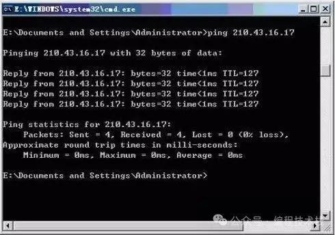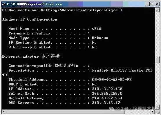 如圖所示,使用ping命令檢查到IP地址210.43.16.17的計算機(jī)的連通性,該例為連接正常。共發(fā)送了四個測試數(shù)據(jù)包,正確接收到四個數(shù)據(jù)包。 2、ping命令的基本應(yīng)用 一般情況下,用戶可以通過使用一系列ping命令來查找問題出在什么地方,或檢驗網(wǎng)絡(luò)運行的情況。下面就給出一個典型的檢測次序及對應(yīng)的可能故障: ① ping 127.0.0.1 如果測試成功,表明網(wǎng)卡、TCP/IP協(xié)議的安裝、IP地址、子網(wǎng)掩碼的設(shè)置正常。如果測試不成功,就表示TCP/IP的安裝或設(shè)置存在有問題。 ② ping 本機(jī)IP地址 如果測試不成功,則表示本地配置或安裝存在問題,應(yīng)當(dāng)對網(wǎng)絡(luò)設(shè)備和通訊介質(zhì)進(jìn)行測試、檢查并排除。 ③ ping局域網(wǎng)內(nèi)其他IP 如果測試成功,表明本地網(wǎng)絡(luò)中的網(wǎng)卡和載體運行正確。但如果收到0個回送應(yīng)答,那么表示子網(wǎng)掩碼不正確或網(wǎng)卡配置錯誤或電纜系統(tǒng)有問題。 ④ ping 網(wǎng)關(guān)IP 這個命令如果應(yīng)答正確,表示局域網(wǎng)中的網(wǎng)關(guān)路由器正在運行并能夠做出應(yīng)答。 ⑤ ping 遠(yuǎn)程IP 如果收到正確應(yīng)答,表示成功的使用了缺省網(wǎng)關(guān)。對于撥號上網(wǎng)用戶則表示能夠成功的訪問Internet(但不排除ISP的DNS會有問題)。 ⑥ ping localhost local host是系統(tǒng)的網(wǎng)絡(luò)保留名,它是127.0.0.1的別名,每臺計算機(jī)都應(yīng)該能夠?qū)⒃撁洲D(zhuǎn)換成該地址。否則,則表示主機(jī)文件(/Windows/host)中存在問題。 ⑦ ping www.yahoo.com(一個著名網(wǎng)站域名) 對此域名執(zhí)行Ping命令,計算機(jī)必須先將域名轉(zhuǎn)換成IP地址,通常是通過DNS服務(wù)器。如果這里出現(xiàn)故障,則表示本機(jī)DNS服務(wù)器的IP地址配置不正確,或它所訪問的DNS服務(wù)器有故障。 如果上面所列出的所有ping命令都能正常運行,那么計算機(jī)進(jìn)行本地和遠(yuǎn)程通信基本上就沒有問題了。但是,這些命令的成功并不表示你所有的網(wǎng)絡(luò)配置都沒有問題,例如,某些子網(wǎng)掩碼錯誤就可能無法用這些方法檢測到。 3、* ping命令*的常用參數(shù)選項 ping IP -t: 連續(xù)對IP地址執(zhí)行ping命令,直到被用戶以Ctrl C中斷。 ping IP -l 2000: 指定ping命令中的特定數(shù)據(jù)長度(此處為2000字節(jié)),而不是缺省的32字節(jié)。 ping IP -n 20: 執(zhí)行特定次數(shù)(此處是20)的ping命令。 二、ipconfig命令ipconfig實用程序可用于顯示當(dāng)前的TCP/IP配置的設(shè)置值。這些信息一般用來檢驗人工配置的TCP/IP設(shè)置是否正確。 而且,如果計算機(jī)和所在的局域網(wǎng)使用了動態(tài)主機(jī)配置協(xié)議DHCP,使用ipconfig命令可以了解到你的計算機(jī)是否成功地租用到了一個IP地址,如果已經(jīng)租用到,則可以了解它目前得到的是什么地址,包括IP地址、子網(wǎng)掩碼和缺省網(wǎng)關(guān)等網(wǎng)絡(luò)配置信息。 下面給出最常用的選項: 1、ipconfig 當(dāng)使用不帶任何參數(shù)選項ipconfig命令時,顯示每個已經(jīng)配置了的接口的IP地址、子網(wǎng)掩碼和缺省網(wǎng)關(guān)值。 2、*ipconfig*/all 當(dāng)使用all選項時,ipconfig能為DNS和WINS服務(wù)器顯示它已配置且所有使用的附加信息,并且能夠顯示內(nèi)置于本地網(wǎng)卡中的物理地址(MAC)。如果IP地址是從DHCP服務(wù)器租用的,ipconfig將顯示DHCP服務(wù)器分配的IP地址和租用地址預(yù)計失效的日期。圖為運行ipconfig /all命令的結(jié)果窗口。