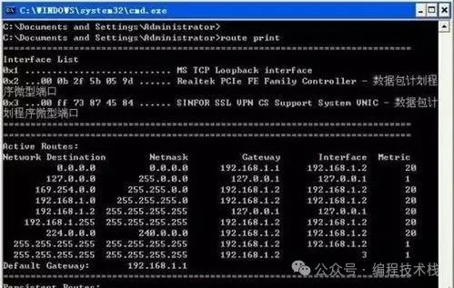 輸出有5列 第一列是描述路徑的第n跳的數(shù)值,即沿著該路徑的路由器序號; 第二列是第一次往返時延; 第三列是第二次往返時延; 第四列是第三次往返時延; 第五列是路由器的名字及其輸入端口的IP地址。 如果源從任何給定的路由器接收到的報文少于3條(由于網(wǎng)絡(luò)中的分組丟失),traceroute在該路由器號碼后面放一個星號,并報告到達(dá)那臺路由器的少于3次的往返時間。 此外,tracert命令還可以用來查看網(wǎng)絡(luò)在連接站點時經(jīng)過的步驟或采取哪種路線,如果是網(wǎng)絡(luò)出現(xiàn)故障,就可以通過這條命令查看出現(xiàn)問題的位置。 思考: 【測試大型網(wǎng)絡(luò)的路由】: (1)多嘗試幾次“ping www.sina.com.cn”操作,比較得到的新浪網(wǎng)的IP地址。如果兩次ping得到的IP地址不同,試考慮其中的原因(如考慮到負(fù)載均衡)。然后,針對這些不同的IP地址,執(zhí)行“tracert ip_address”命令,觀察分析輸出的結(jié)果是否有差異。 (2)對于大型網(wǎng)絡(luò)中的某站點進(jìn)行traceroute測試,記錄測試結(jié)果。觀察其中是否出現(xiàn)第n跳的時延小于第n-1跳的時延情況。試分析其中原因(提示:可分別考慮時延的各個構(gòu)成成分在總時延中所起的作用)。 (3)在一天的不同時段內(nèi),用traceroute程序多次測試從固定主機(jī)到遠(yuǎn)程固定IP地址的主機(jī)的路由。試分析比較測量數(shù)據(jù),觀察該路由是否有變化?如果有變化,該變化頻繁嗎? 五、route命令大多數(shù)主機(jī)一般都是駐留在只連接一臺路由器的網(wǎng)段上。由于只有一臺路由器,因此不存在選擇使用哪一臺路由器將數(shù)據(jù)包發(fā)送到遠(yuǎn)程計算機(jī)上去的問題,該路由器的IP地址可作為該網(wǎng)段上所有計算機(jī)的缺省網(wǎng)關(guān)。 但是,當(dāng)網(wǎng)絡(luò)上擁有兩個或多個路由器時,用戶就不一定想只依賴缺省網(wǎng)關(guān)了。實際上可能想讓某些遠(yuǎn)程IP地址通過某個特定的路由器來傳遞,而其他的遠(yuǎn)程IP則通過另一個路由器來傳遞。在這種情況下,用戶需要相應(yīng)的路由信息,這些信息儲存在路由表中,每個主機(jī)和每個路由器都配有自己獨一無二的路由表。大多數(shù)路由器使用專門的路由協(xié)議來交換和動態(tài)更新路由器之間的路由表。但在有些情況下,必須人工將項目添加到路由器和主機(jī)上的路由表中。route命令就是用來顯示、人工添加和修改路由表項目的。該命令可使用如下選項: 1、route print 本命令用于顯示路由表中的當(dāng)前項目,在單個路由器網(wǎng)段上的輸出結(jié)果如圖所示。