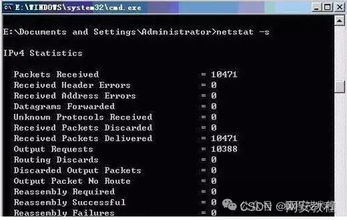上圖顯示的是一個路由表,其中:Network Destination表示目的網(wǎng)絡(luò),0.0.0.0表示不明網(wǎng)絡(luò),這是設(shè)置默認(rèn)網(wǎng)關(guān)后系統(tǒng)自動產(chǎn)生的;127.0.0.0表示本機(jī)網(wǎng)絡(luò)地址,用于測試;224.0.0.0表示組播地址;255.255.255.255表示限制廣播地址;Netmask表示網(wǎng)絡(luò)掩碼,Gateway表示網(wǎng)關(guān),Interface表示接口地址,Metric表示路由跳數(shù)。 ⑤ netstat -s: -s選項能夠按照各個協(xié)議分別顯示其統(tǒng)計數(shù)據(jù)。這樣就可以看到當(dāng)前計算機(jī)在網(wǎng)絡(luò)上存在哪些連接,以及數(shù)據(jù)包發(fā)送和接收的詳細(xì)情況等等。如果應(yīng)用程序(如Web瀏覽器)運行速度比較慢,或者不能顯示W(wǎng)eb頁之類的數(shù)據(jù),那么可以用本選項來查看一下所顯示的信息。仔細(xì)查看統(tǒng)計數(shù)據(jù)的各行,找到出錯的關(guān)鍵字,進(jìn)而確定問題所在。