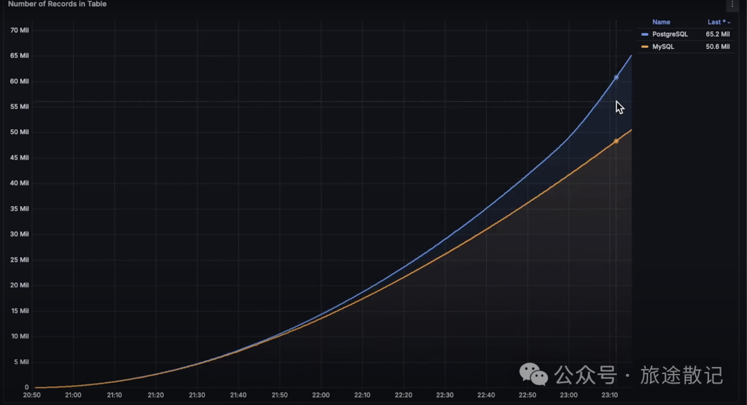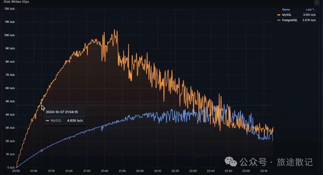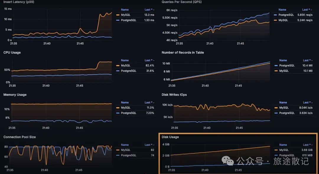 本內(nèi)容是對(duì)知名性能評(píng)測(cè)博主 Anton Putra MySQL vs PostgreSQL Performance Benchmark (Latency - Throughput - Saturation)[1] 內(nèi)容的翻譯與整理, 有適當(dāng)刪減, 相關(guān)指標(biāo)和結(jié)論以原作為準(zhǔn) MySQL vs PostgreSQL 數(shù)據(jù)庫(kù)性能對(duì)比在本內(nèi)容中,我們將對(duì)比 MySQL 和 PostgreSQL 關(guān)系型數(shù)據(jù)庫(kù)的性能。我們將運(yùn)行一系列測(cè)試,其中 第一項(xiàng)測(cè)試 重點(diǎn)關(guān)注 數(shù)據(jù)寫(xiě)入(ingestion)效率。 首先,我們會(huì)測(cè)量: