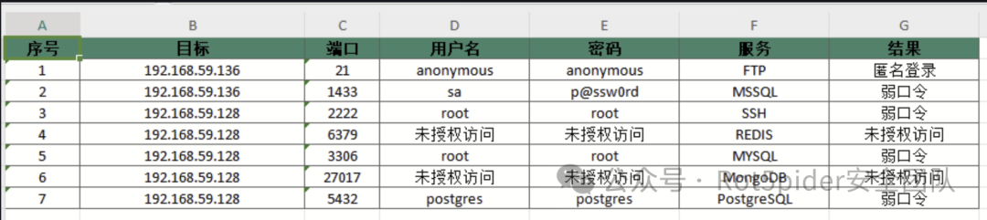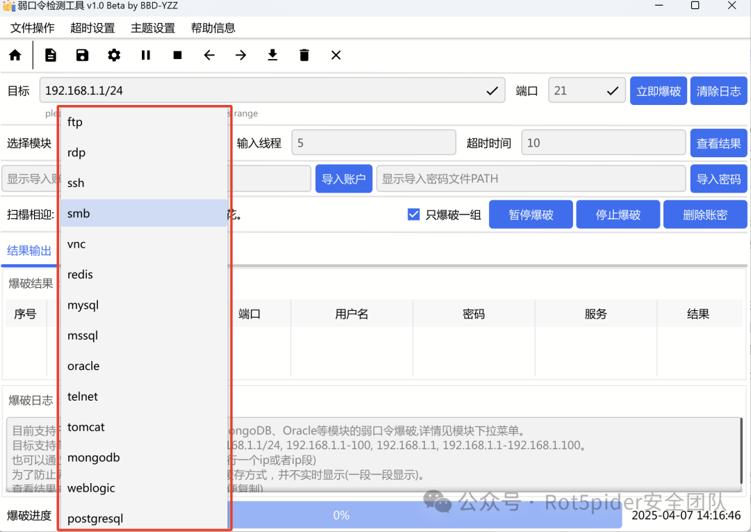 ? 一鍵檢測(cè)13種服務(wù):FTP、RDP、SSH、SMB、VNC、Redis、MySQL/MSSQL/Oracle、Telnet、Tomcat、MongoDB、WebLogic、PostgreSQL
