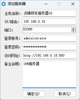 導(dǎo)讀 點(diǎn)晴公司原創(chuàng)作品。之前用其他類似功能軟件實(shí)現(xiàn)公司多臺(tái)服務(wù)器的訪問管理,但擔(dān)心會(huì)竊取密碼或造成密碼泄露,另外主要是無法自定義窗口大小,導(dǎo)致使用時(shí)要么全屏,要么拖動(dòng)遠(yuǎn)程桌面窗口滾動(dòng)條,如果本地電腦有新信息提醒時(shí),容易漏掉,很不方便,于是就有了這個(gè)免費(fèi)作品的問世,歡迎各位管理員下載使用。 ?? 點(diǎn)晴Windows遠(yuǎn)程桌面管理器 是深圳市點(diǎn)晴信息技術(shù)有限公司開發(fā)的一款免費(fèi)Windows遠(yuǎn)程桌面批量管理程序,本程序?yàn)閱纬绦蚓G色軟件,大小僅100KB,無需安裝,直接下載到本地適當(dāng)位置,然后雙擊打開運(yùn)行即可。 程序特點(diǎn): 1、可以實(shí)現(xiàn)大量Windows系統(tǒng)遠(yuǎn)程桌面的批量管理,最多可以管理999臺(tái)電腦; 2、設(shè)置的Windows系統(tǒng)連接信息采用了結(jié)合用戶密碼的動(dòng)態(tài)加密技術(shù),即使拿到了配置文件也無法查看到實(shí)際的電腦名稱、IP地址、登錄用戶名、密碼、網(wǎng)址、備注等信息; 3、可以直接雙擊設(shè)置好的主機(jī)自動(dòng)進(jìn)入遠(yuǎn)程桌面連接程序,無需用戶手工輸入主機(jī)連接地址、用戶名和密碼; 4、為了確保信息安全,可以并應(yīng)該設(shè)置進(jìn)入密碼,用戶必須牢牢記住設(shè)置的進(jìn)入密碼,如果忘記了進(jìn)入密碼,那么只能刪除ini配置文件,重新從零開始配置程序; 5、為了方便管理員長時(shí)間使用Windows系統(tǒng)遠(yuǎn)程桌面時(shí),不被遠(yuǎn)程桌面程序遮擋正常的本地桌面,本程序允許設(shè)置自定義遠(yuǎn)程桌面窗口大小,用戶可以設(shè)置遠(yuǎn)程桌面大小恰巧比本地桌面小一些,避免遠(yuǎn)程桌面出現(xiàn)滾動(dòng)條,此功能可以將遠(yuǎn)程桌面完全模擬為本地窗口的一部分,非常實(shí)用; 6、可以設(shè)置主機(jī)綁定網(wǎng)址,方便直接訪問主機(jī)上的網(wǎng)站。 下載地址: 附件:點(diǎn)晴Windows遠(yuǎn)程桌面管理器.rar(83KB) 使用方法: 1、下載執(zhí)行程序 下載以上程序,解壓到適當(dāng)位置,雙擊執(zhí)行,執(zhí)行后會(huì)自動(dòng)創(chuàng)建配置文件; 2、添加服務(wù)器 點(diǎn)擊程序主窗口右邊“添加”按鈕: