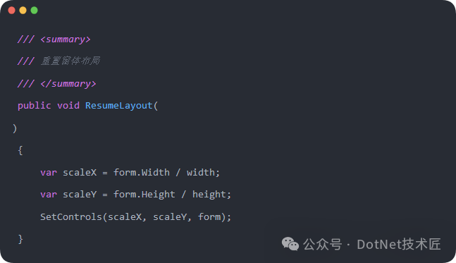 2、FormAutoSize 類的構(gòu)造方法中初始化字段并存儲控件屬性初始化字段 InitialWidth 和 InitialHeight 分別存儲窗體的初始寬度和高度。 TargetForm 存儲當(dāng)前要進(jìn)行自適應(yīng)處理的窗體對象。 存儲控件屬性 在構(gòu)造方法中,遍歷窗體上的所有控件。 將每個控件的寬度、高度、左邊距、上邊距以及字體大小按分號拼接成一個字符串,并存儲到該控件的 AccessibleDescription 屬性中。 使用 AccessibleDescription 屬性 AccessibleDescription 是一個較少使用的屬性,適合用來存儲臨時或自定義的數(shù)據(jù),而不會影響控件的正常功能。 通過這種方式,我們可以方便地在后續(xù)操作中讀取和應(yīng)用這些存儲的屬性值,實(shí)現(xiàn)窗體及其控件的自動縮放和自適應(yīng)布局。