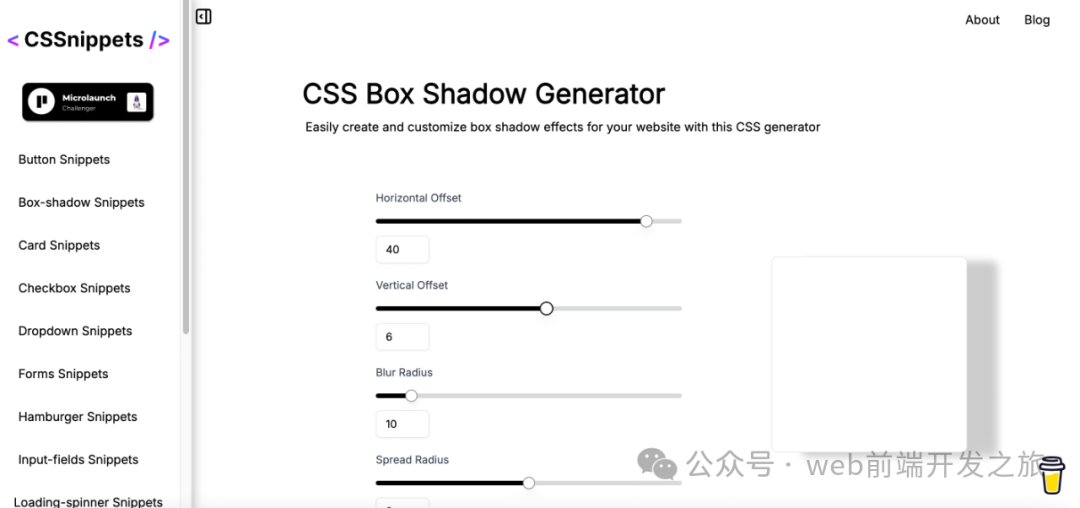 陰影生成器簡(jiǎn)介:輕松定制元素的陰影效果!設(shè)置陰影的偏移、模糊、擴(kuò)散距離和顏色,實(shí)時(shí)查看效果,復(fù)制 CSS 一鍵搞定。 訪問(wèn)網(wǎng)址:https://cssnippets.shefali.dev/boxshadowgenerator