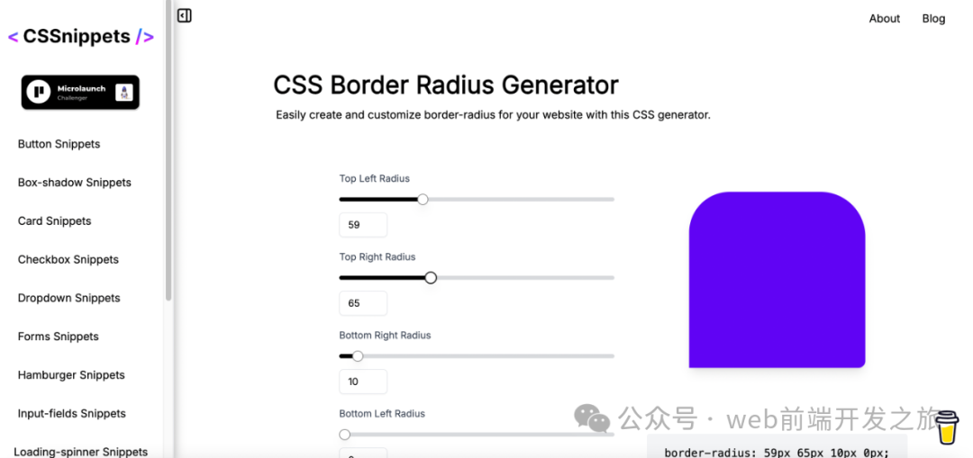 圓角生成器簡(jiǎn)介:快速為元素添加圓角樣式。支持單獨(dú)控制四個(gè)角的圓角半徑,讓你的卡片或按鈕更加柔和美觀。 訪問(wèn)網(wǎng)址:https://cssnippets.shefali.dev/borderradiusgenerator