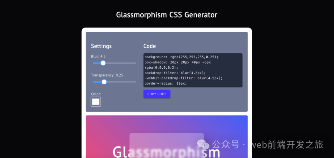 毛玻璃效果生成器簡(jiǎn)介:一鍵創(chuàng)建毛玻璃風(fēng)格效果。設(shè)置透明度、模糊度、背景層疊效果,非常適合做卡片式設(shè)計(jì)或半透明 UI。 訪問(wèn)網(wǎng)址:https://markodenic.com/tools/glassmorphism-css-generator/