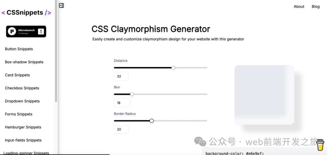 粘土風(fēng)格生成器簡(jiǎn)介:最近流行的 Claymorphism 風(fēng)格也能一鍵搞定!這個(gè)工具讓你輕松設(shè)置偏移、模糊、圓角等參數(shù),營(yíng)造柔和立體的 UI 視覺(jué)。 訪問(wèn)網(wǎng)址:https://cssnippets.shefali.dev/claymorphismgenerator