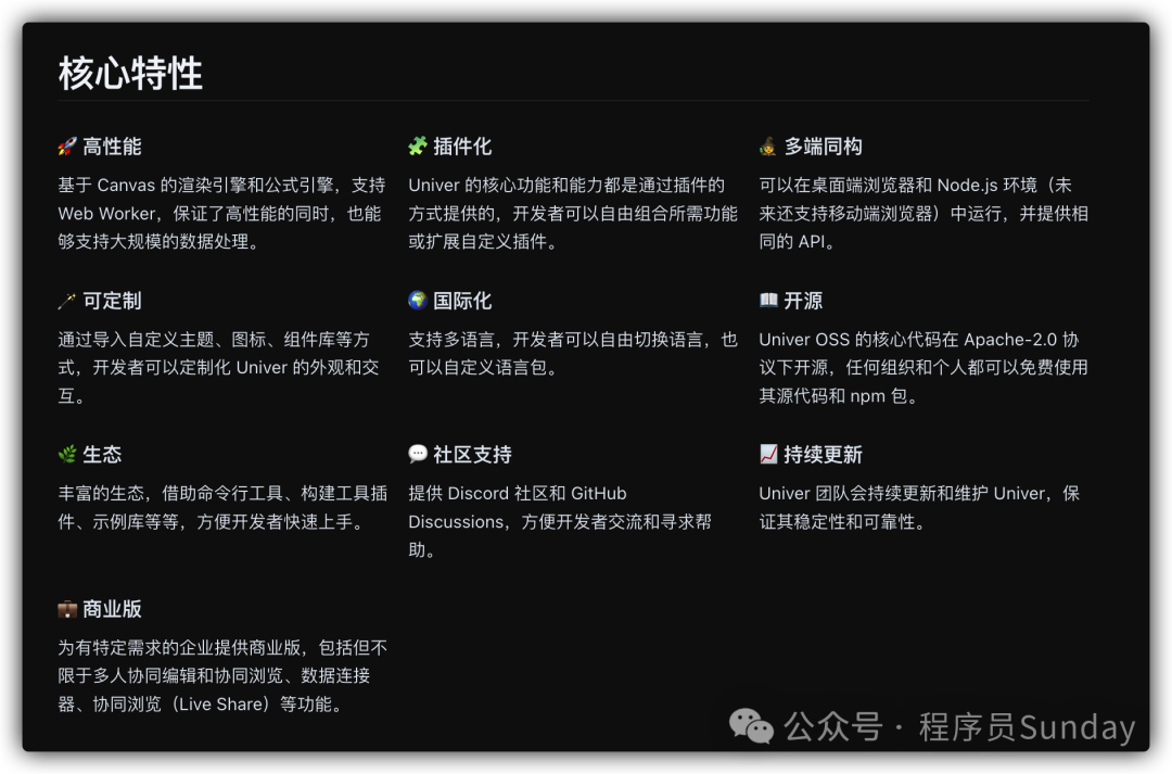 三大核心文檔類型的企業(yè)級協(xié)同平臺。它不僅支持多人協(xié)作,還提供了高效的文檔管理和數(shù)據(jù)處理能力。無論是個人辦公還是團隊協(xié)作,Univer 都能幫助你實現(xiàn)智能化的文檔與數(shù)據(jù)管理。 核心特性Univer 提供了一系列功能豐富、靈活定制的核心特性,幫助開發(fā)者根據(jù)需求定制和擴展功能。下圖展示了 Univer 的主要特性和組件架構(gòu),能夠為企業(yè)提供穩(wěn)定高效的工作環(huán)境。