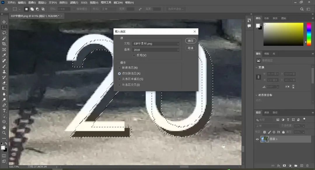 5.打開選擇-載入選區(qū),通道選擇剛才保存的“2018選區(qū)”,操作選擇“添加到選區(qū)”,然后確定。