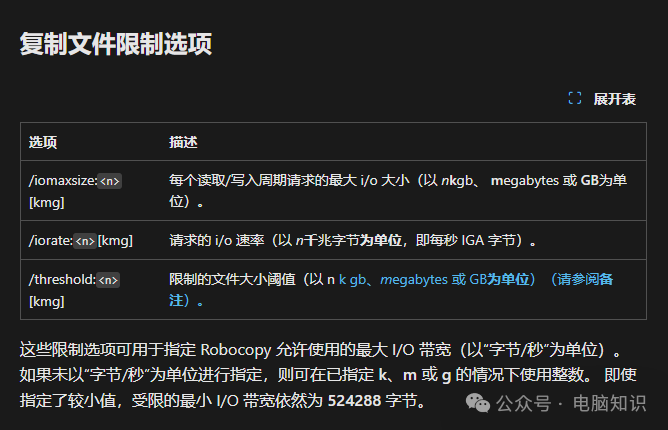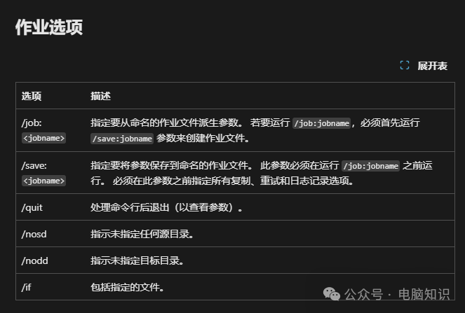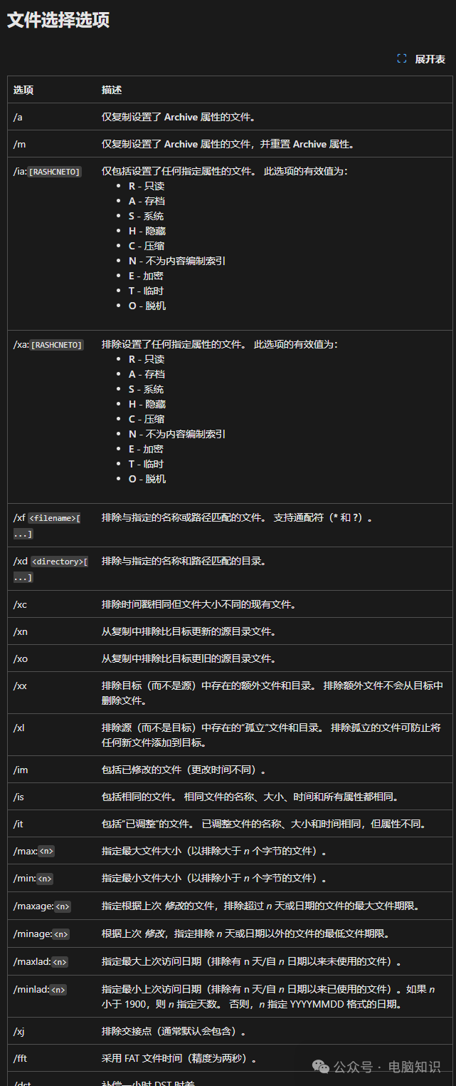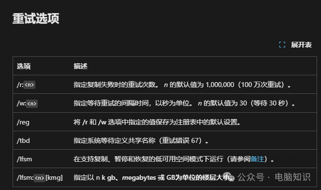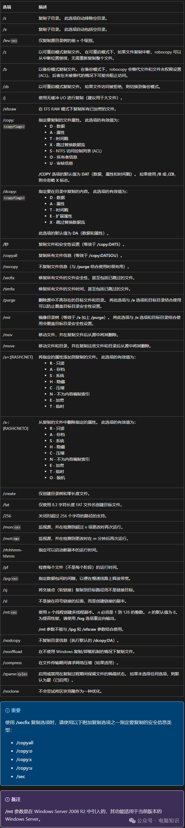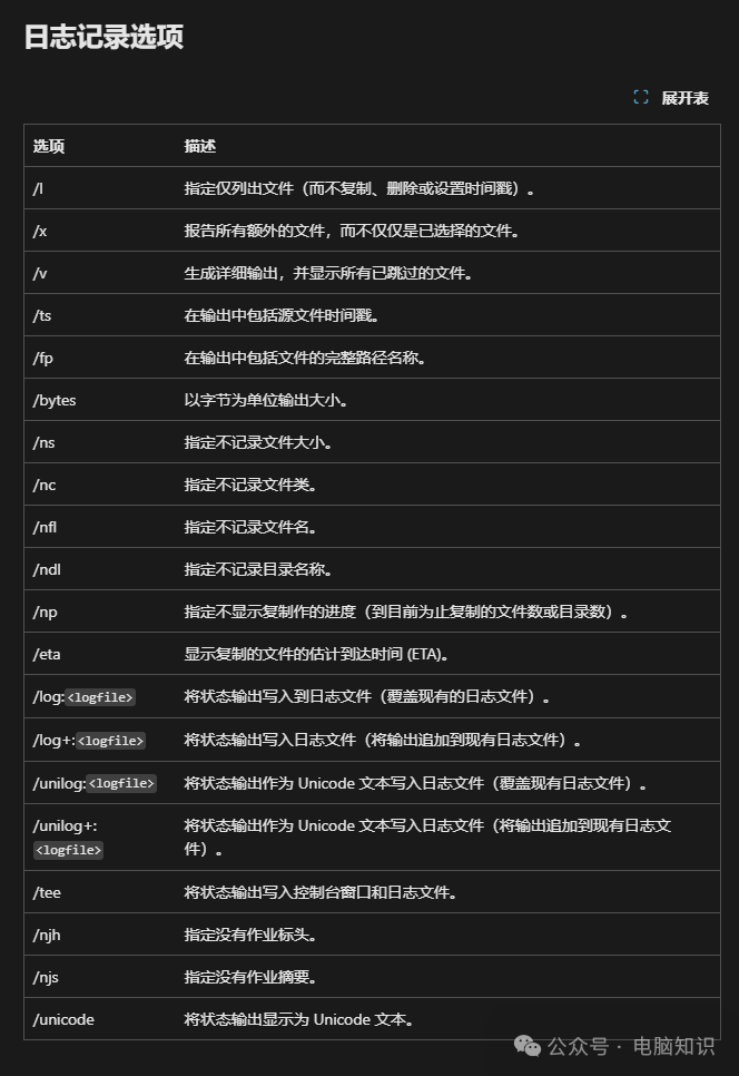關(guān)鍵要素說明: 源路徑:支持本地路徑(C:\Data)或網(wǎng)絡(luò)路徑(\\Server\Share) 目標(biāo)路徑:必須已存在,否則會(huì)報(bào)錯(cuò) [文件]:指定要復(fù)制的一個(gè)或多個(gè)文件。 支持通配符(* 或 ?)。 如果未指定此參數(shù),*.* 將用作默認(rèn)值。 [參數(shù)]:指定要與 robocopy 命令結(jié)合使用的選項(xiàng),包括復(fù)制、文件、重試、日志記錄和作業(yè)選項(xiàng)。核心功能開關(guān),下文詳解。 三、常用參數(shù)速查表
