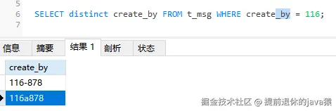MySQL 會(huì)嘗試將 VARCHAR 類型的 create_by 字段值轉(zhuǎn)換為數(shù)字類型,然后再與 116 進(jìn)行比較。在轉(zhuǎn)換過(guò)程中,MySQL 會(huì)從字符串的開(kāi)頭開(kāi)始解析數(shù)字,直到遇到非數(shù)字字符為止。如果字符串開(kāi)頭沒(méi)有有效的數(shù)字,那么轉(zhuǎn)換結(jié)果為 0